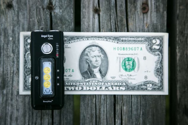 The A5x rovyvon light is a keychain flashlight (one of many) from RovyVon that has a translucent polycarbonate shell. The reason I chose to cover it in this review is that it features two types of LEDs that emit from the side — one white light and one UV. The casing glows in the dark in green, blue and purple. The glow only lasts for about a minute before fading away, but it “charges” very quickly from the flashlight’s own luminance.