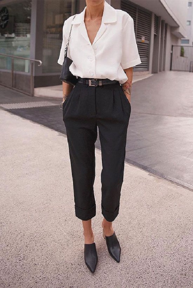 You can pair your white shirt with black wide-leg trousers and an elegant round-collar short blazer jacket for a modern and elongating office look. You can also wear tan chinos and have the shirt sleeves rolled up for a relaxed feel to the professional outfit. Also, high waisted work trousers go well with a short-sleeved white cotton shirt.